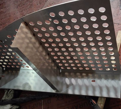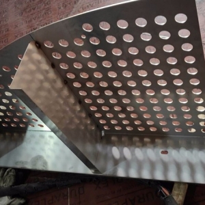 脫硫塔、噴淋塔、冷卻塔、濕電除塵等脫硫脫銷除塵設備煙氣均布裝置,材質一般有304,316L,2205,2507,1.4529,C-276等,厚度2-4mm,通孔率35-45%,圓孔直徑一般35mm,托盤的大小根據塔體的直徑變化,合金托盤整套設備包含:托盤主體,抱箍,夾板,定矩管,螺栓組件等。一般裝在脫硫脫銷設備下氣室,高度根據塔大小確定。